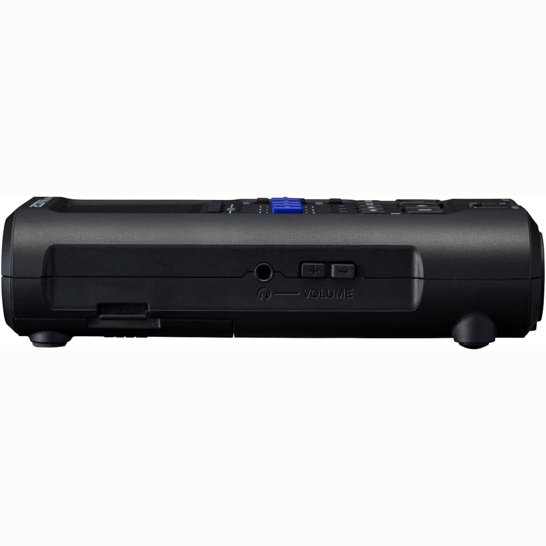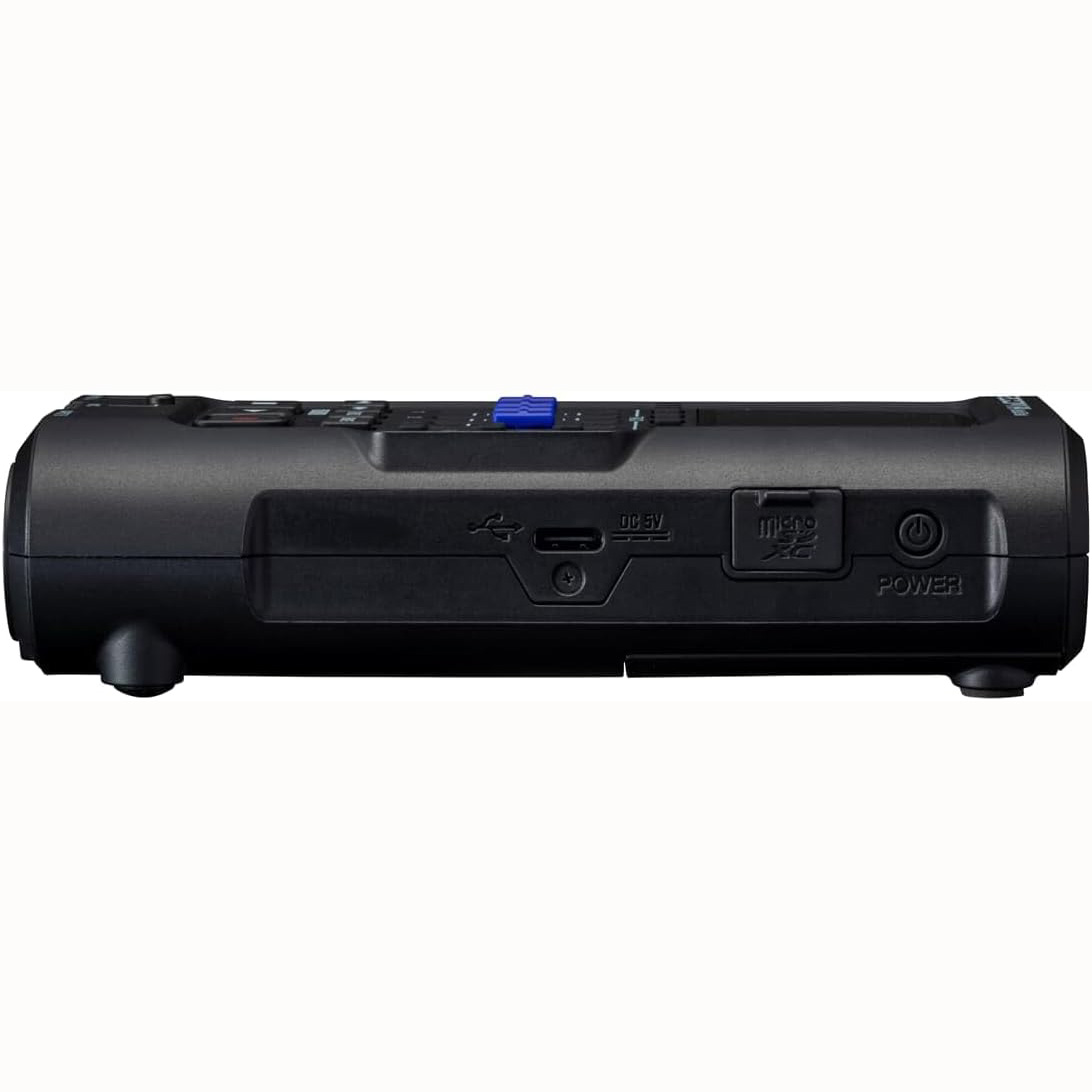 También incluye una sección rítmica con patrones de batería integrados para tocar o ensayar con acompañamiento, y puede funcionar con 4 pilas AA o mediante su puerto USB-C, lo que la hace ideal para grabar en cualquier lugar, incluso sin acceso a corriente.
