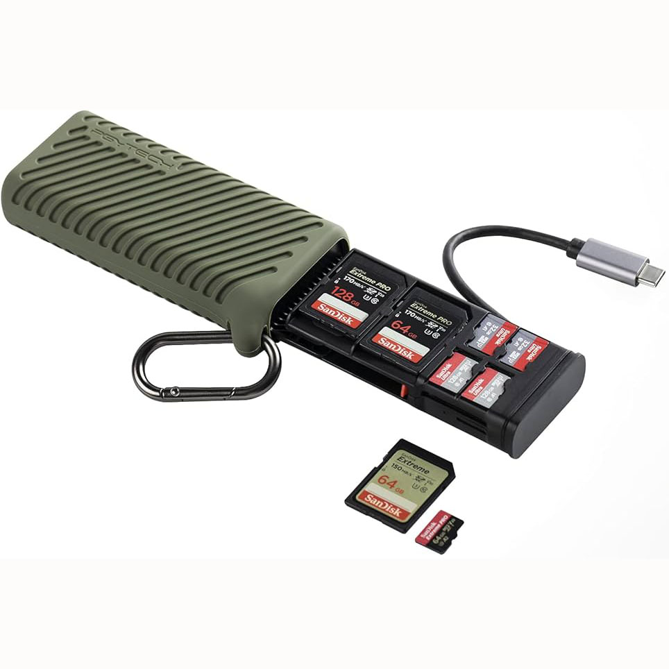 Transporta y gestiona tus tarjetas de memoria mientras transfieres datos a velocidades de hasta 1000 MB/s gracias al estuche con lector CreateMate CFexpress Tipo B de PGYTECH en color verde musgo. Este dispositivo incorpora una ranura para tarjetas CFexpress Tipo B y otra para tarjetas SD UHS-II SDXC. Además, dispone de compartimentos para guardar dos tarjetas CFexpress Tipo B, tres tarjetas SD, cuatro microSD y dos nano SIM.