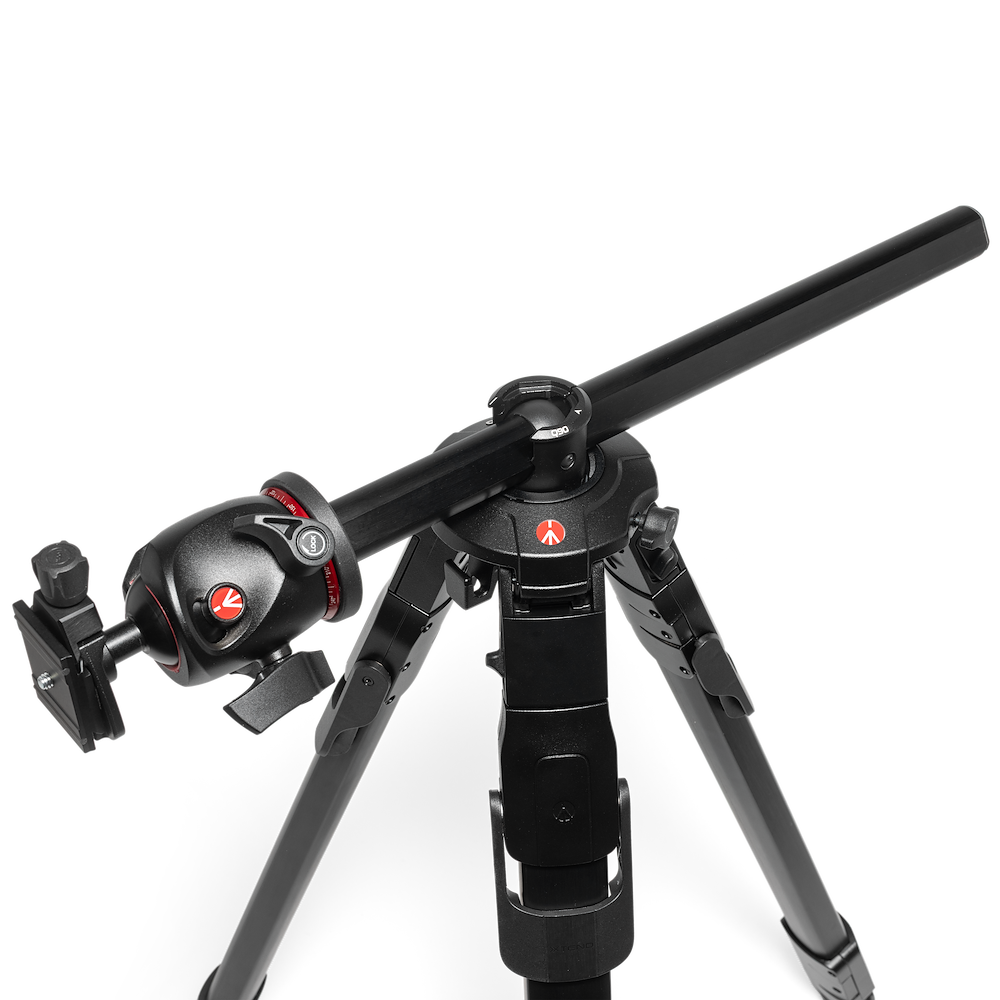 La columna central deslizante permite ajustes rápidos y precisos del encuadre y facilita tomas a ras de suelo. Para fotografía cenital y flat lay, el mecanismo Q90 pasa instantáneamente de vertical a horizontal.