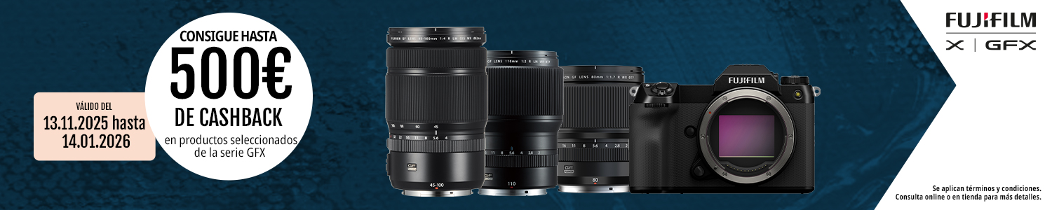 Solicita tu reembolso en https://www.fujifilm-x.com/es-es/promotions/ CUERPO FUJI GFX 100S II BLACK FUJIFILM 5.499,00€ Comprar CUERPO FUJI GFX 100 II FUJIFILM 7.990,00€ Comprar OBJETIVO FUJI GF 55/1.7 R WR FUJIFILM 2.590,00€ Comprar OBJETIVO FUJI GF 20-35/4 R WR FUJIFILM 2.799,00€ Comprar OBJETIVO FUJI GF 80/1.7 R WR FUJIFILM 2.299,00€ Comprar OBJETIVO FUJI GF 45-100/4 R LM OIS … FUJIFILM 2.399,00€ Comprar OBJETIVO FUJI GF 100-200/5.6 R LM OIS … FUJIFILM 1.999,00€ Comprar OBJETIVO FUJI GF 110/2 R LM WR FUJIFILM 2.999,00€ Comprar OBJETIVO FUJI GF 32-64/4 R LM WR FUJIFILM 2.499,00€ Comprar